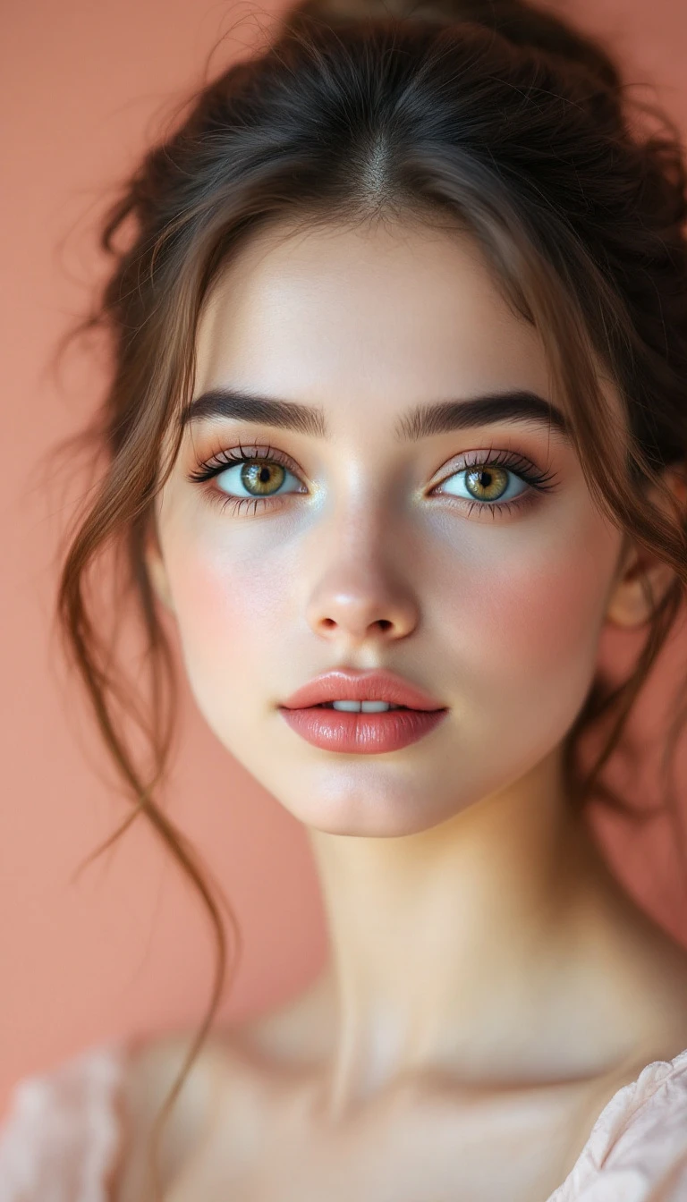 A beautiful girl with brown hair in a low bun and light makeup, big eyes, peach pink background wall, half-length photo shows her portrait in natural lighting with soft tones, close-up of her face with light blush on her cheeks, glossy lips, and delicate skin texture, natural expression with soft shadows --ar 71:128 --stylize 750 --v 6. 1