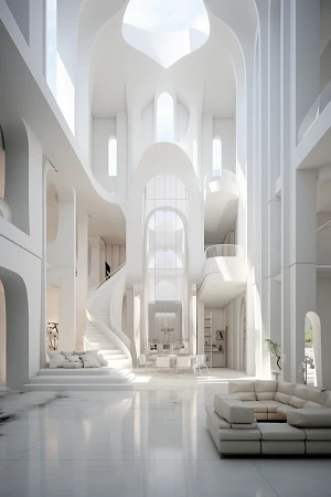 A minimalist design with modernist building style, white & gray monochromatic color on interior walls, entrance, abstract art Times Anton Pieck, futuristic-themed, rectangular outline, colorblocked glass panels, open-section, various sculptures, natural light, geometric pattern --v 5. 2 --ar 2:3