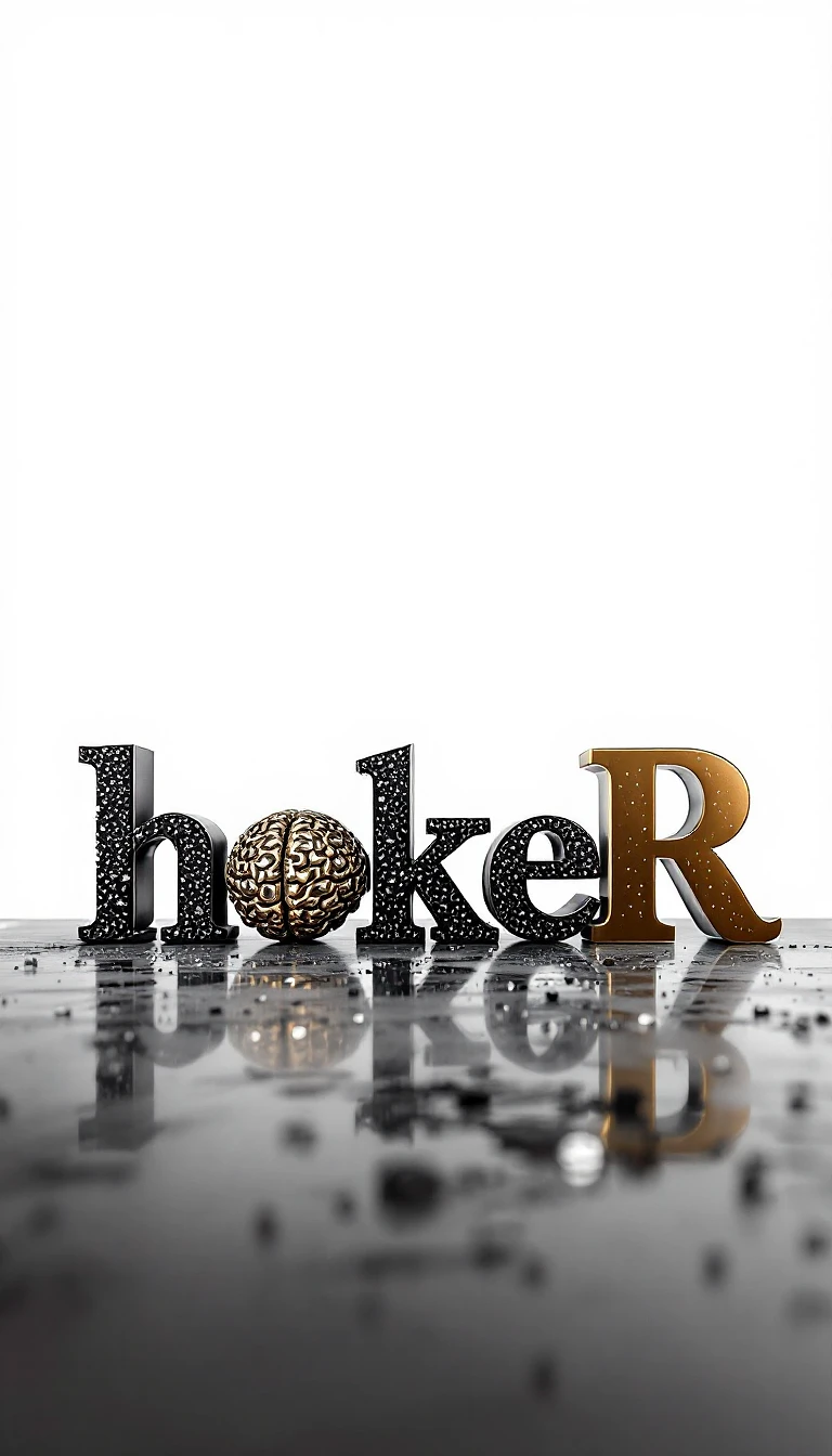 A super professional 3D standing on metal floor black tiny matte diamonds black so tiny diamonds matte metallic capital standing font style word "JonnyJokeR" and super professional 3D realistic golden brain, and matte black so tiny diamonds matte metallic calligraphy font style word "house", on the "JonnyJokeR" word, In white background