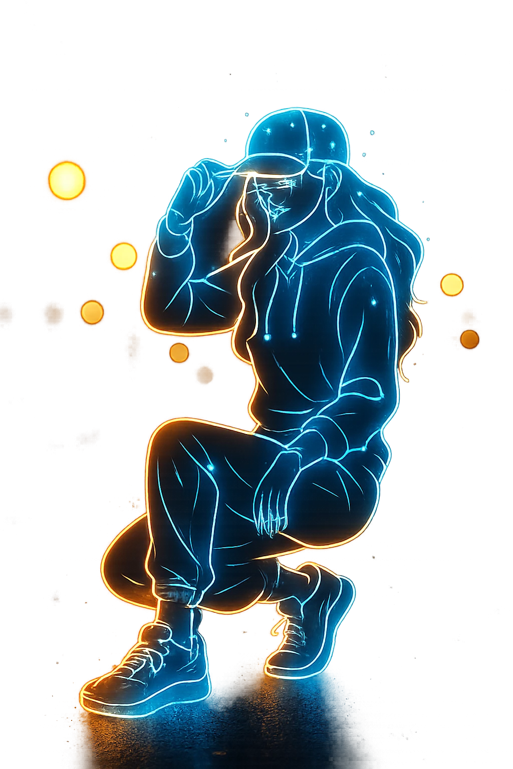 A realistic blurred photo of a night park glowing with warm lights. In the foreground, a glowing white line art of a young beautiful female hip hop music artist in a cool dance pose standing up. Her glowing shoes and street dance outfit emit soft light, and her baseball hat has playful drips and sparkles. blue and orange illustration