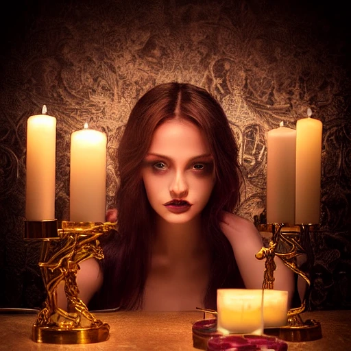 fine art portrait of beautiful attractive necromancer at a bar surrounded by candles sitting on the bar and candlelight, reading a spell book, gold theme, photography, beauty photography fine art photography, ultra realistic, highly detailed, volumetric lighting, cinematic lighting, beautiful backlighting, gorgeous hands, perfect hands, sharp details on face, photography, photorealistic, unreal engine, octane render, volumetric lighting --ar 2:3 --beta --upbeta --upbeta, no deformity