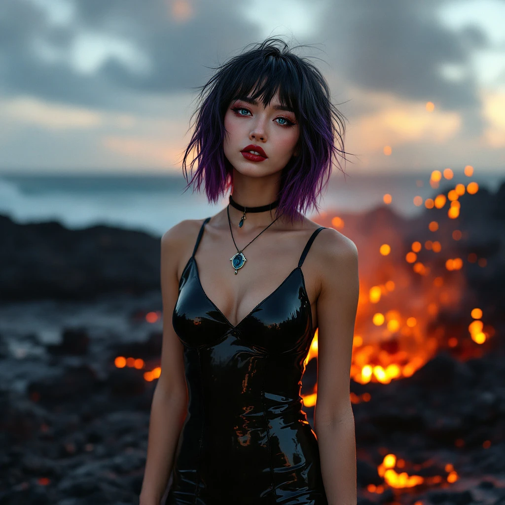 Full Body Image, zoomed out, Photo-Realistic, Complete full body Image of a beautiful, Gorgeous, ((40 years old) ) EMO, Goth, Punk, Japanese, Chinese, Spanish, Korean, Filipina Female, Instagram Influencer-model (((Extra Long layered Messy Black short hair with ((Bangs) ) and purple and red highlights))), Extra Large Bright illuminating Blue Eyes, Full thick dark red lips, standing barefoot in a Hawaiian Park ((Head to Toe) ), Beautiful photo-realistic Beautiful, sharp focus, Wearing a latex dress, rising from the molten lava of a spewing Volcano in Hawaii. Pele the fire goddess. Her wild beauty is more powerful with glowing lava. --v 7
