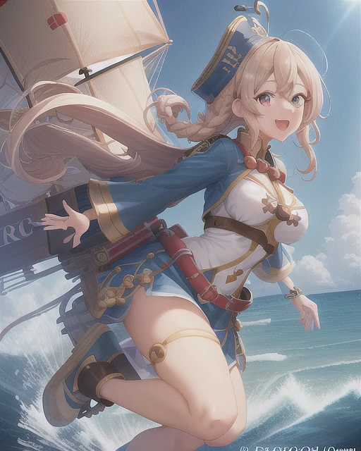 young, child, cat ears, realistic, low quality, blur, poorly drawn face, disfigured, weak colors, not standing on pirate ship