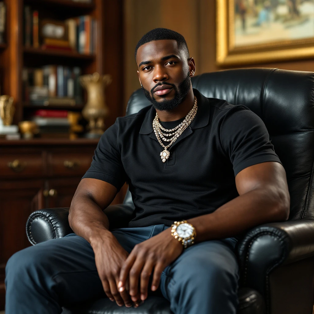 Agangstar lookin black male wearing a polo and trouswers sitting in a studiuio with diamond chains