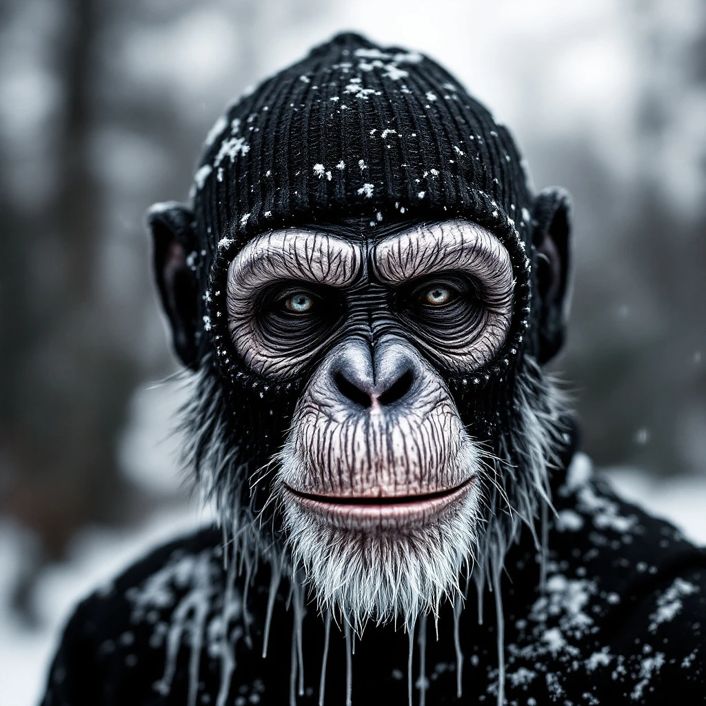 a black ribbed knit skimask, 3 holes, painted flat chimpface on it in wet white paint