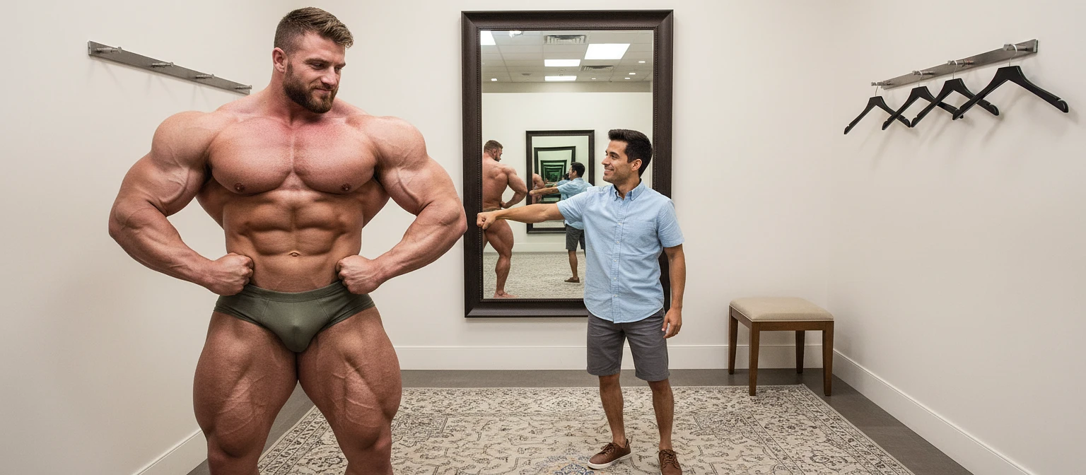 At the clothing store, in the dressing room the bodybuilder is 6'4" tall, he has huge muscular shoulders and super extra huge muscular legs. He is shirtless. He is wearing an olive green underwear. He is flexing his arms upright. He is facing the Hispanic male. The Hispanic male is skinny, he is 5'0" tall, he is wearing a baby blue dressed SHORT sleeve shirt, gray shorts and brown leather sneakers. The Hispanic male is punching with his fist the bodybuilder's stomach