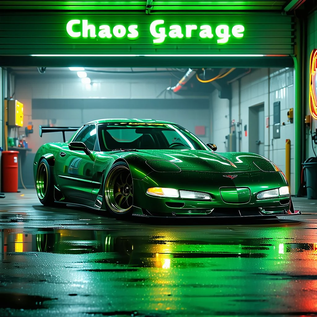 General outline of a latest model British racing green 2000 corvette, with glowing headlights, polished to a high shine, parked in a racing garage with a chaos garage sign glowing light green, bright atmosphere, artgerm, hygge,