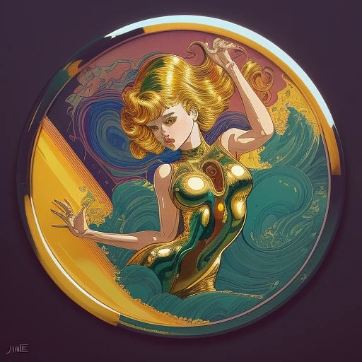 80s chrome and steel Retro Sunset, water, gold, illustration, inspired by James Jean 80s chtome and steel Retro Sunset, scene, green, gold, illustration, inspired by James Jean,