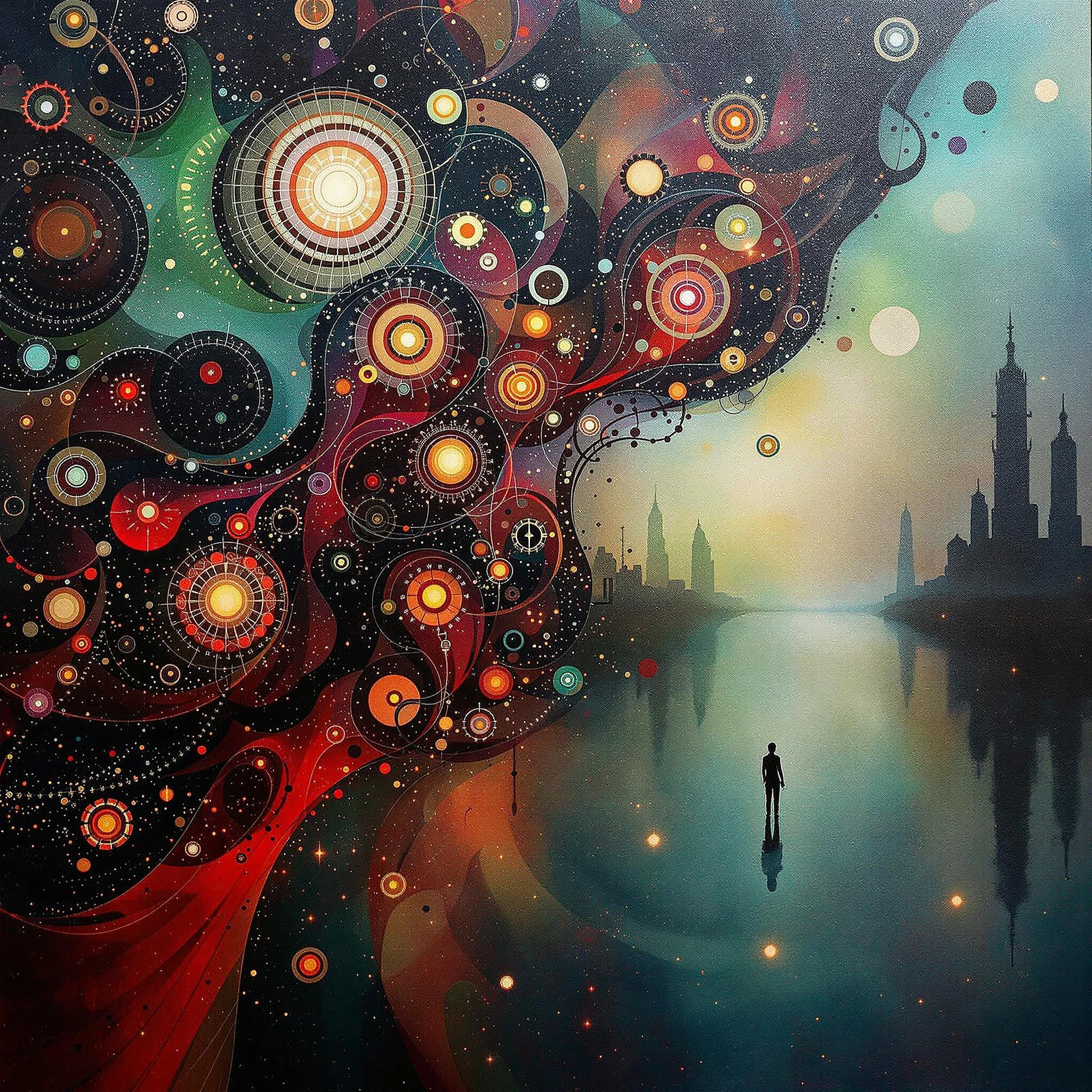 Steampunk bio-morphic ethereal glow. Acrylic splash art, opaline pearlescent ink, translucent glaze. Anthropomorphic Steampunk biomorphic Australian Dreamtime Dot art, hyper textured, spiral fractals concentric circles. A dazzlingly chaotic Digital artwork with intricate details, including dark colors and flawless gradients in precise Pantone shades. rich fabrics in deep reds and greens add movement. More than technique, this exhibition captures emotion, resilience, and presence, honoring the timeless beauty of the human experience through light and shadow. Gritty dark docks in the background