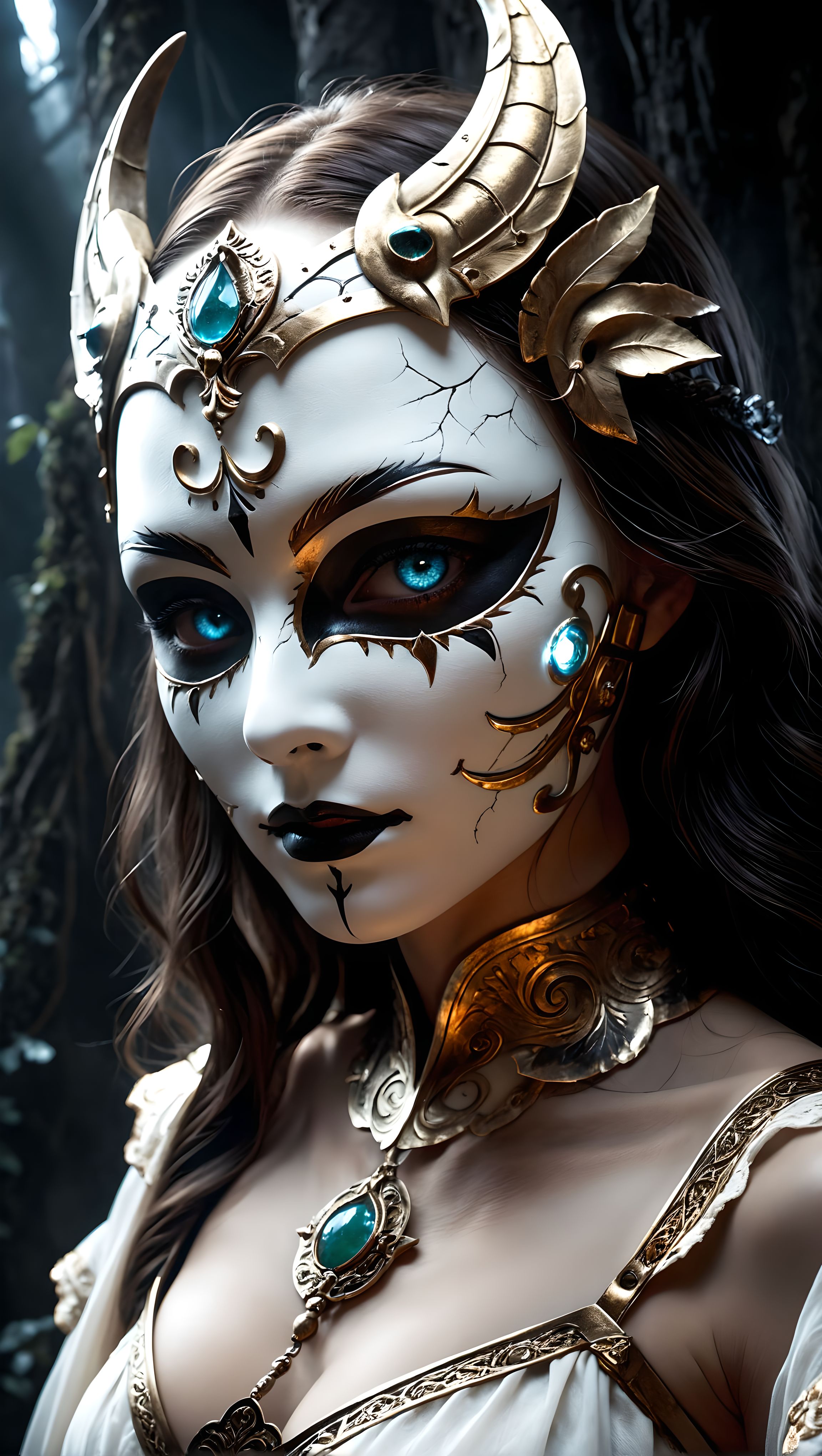 A haunting mask crafted from ancient bone, its surface etched with cryptic markings, hollow eyes exuding an eerie glow, spectral mist rising from its edges, whispers of lost souls echoing in the distance, volumetric lighting casting ghostly highlights, cinematic high contrast interplay between shadows and spectral light, ultra-high-definition, hyper-detailed textures, photorealistic rendering, 8K resolution, masterpiece, trending on ArtStation
