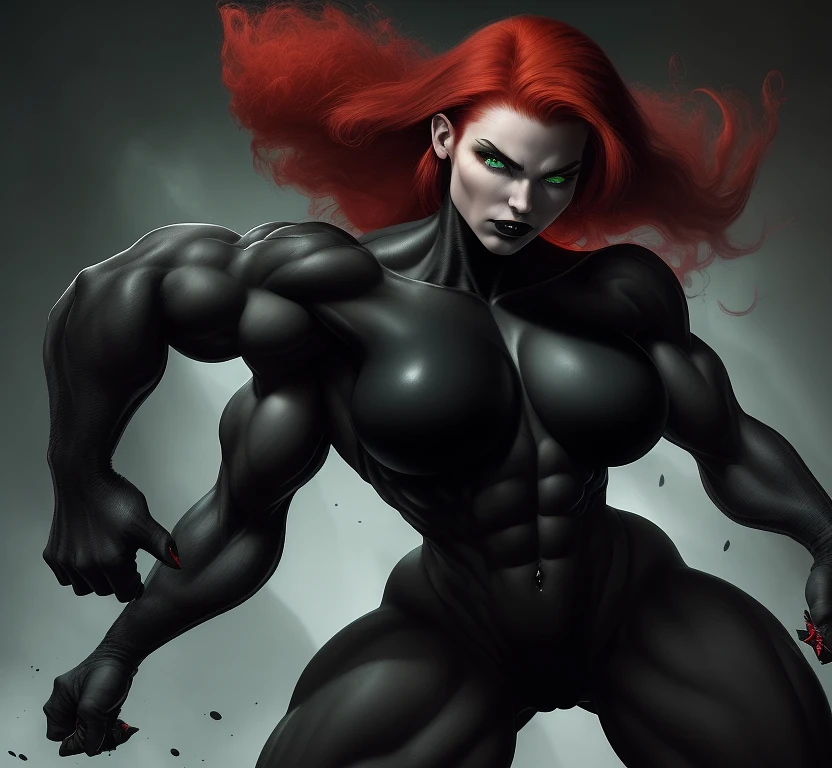 1 young beautiful bodybuilder woman with a wide strong jaw wearing a black monster symbiote, red hair, green eyes, SFW, big arms, big legs,