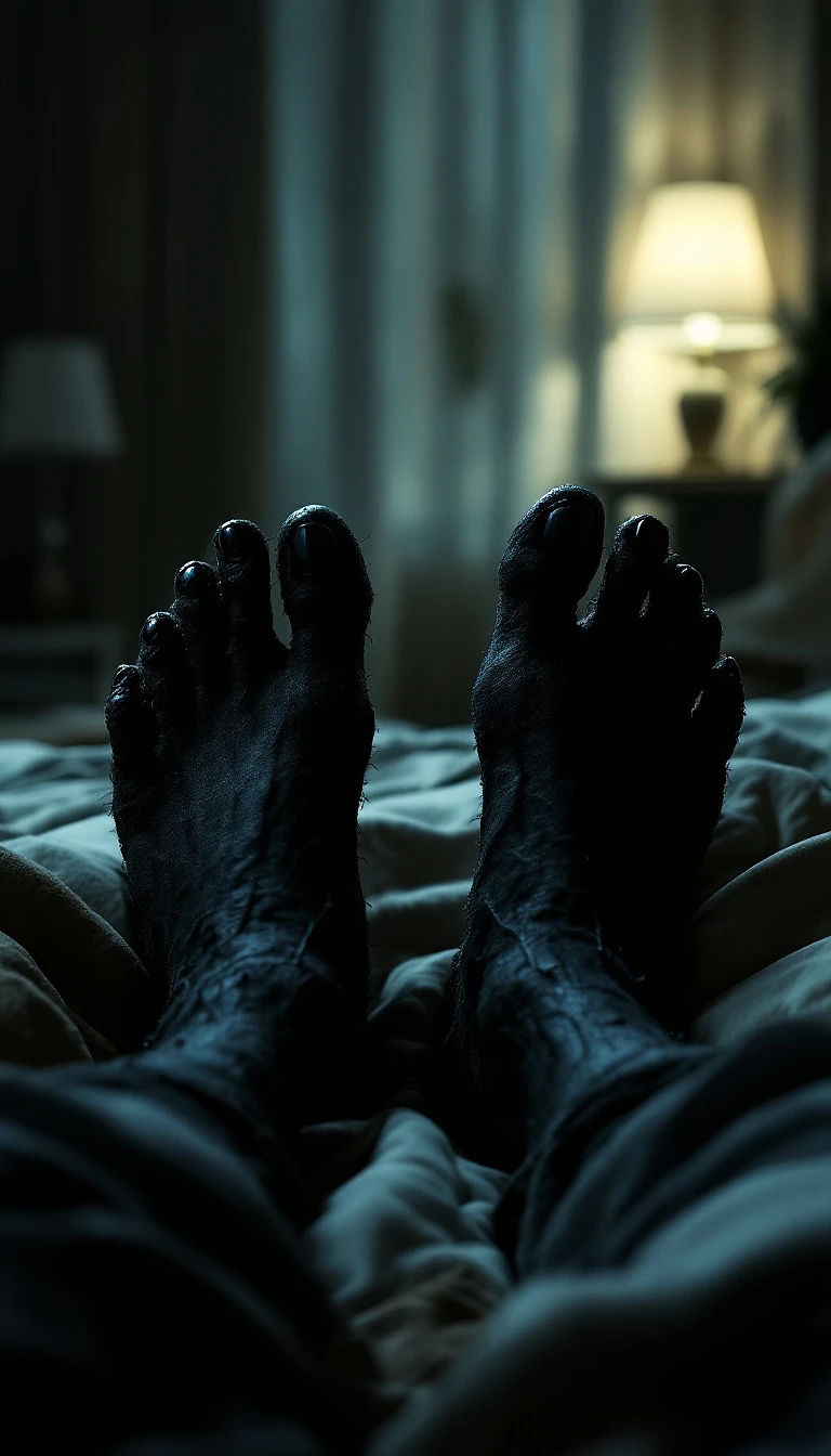 POV first-person, POV, I am a jinn lying on my bed in my room. Only my feet are visible in the frame. My feet are black and covered in coarse hair, shaped like a ram’s hooves. My long, black nails are dirty and unkempt, adding to their eerie appearance. The lighting in the room is dim and moody, casting soft shadows that emphasize the texture of my feet. The room has a modern Iranian decor—minimalist yet warm, with a Persian rug on the floor and subtle traditional elements blended with contemporary furniture. The atmosphere feels surreal and unsettling, as if something unnatural lingers in the air.