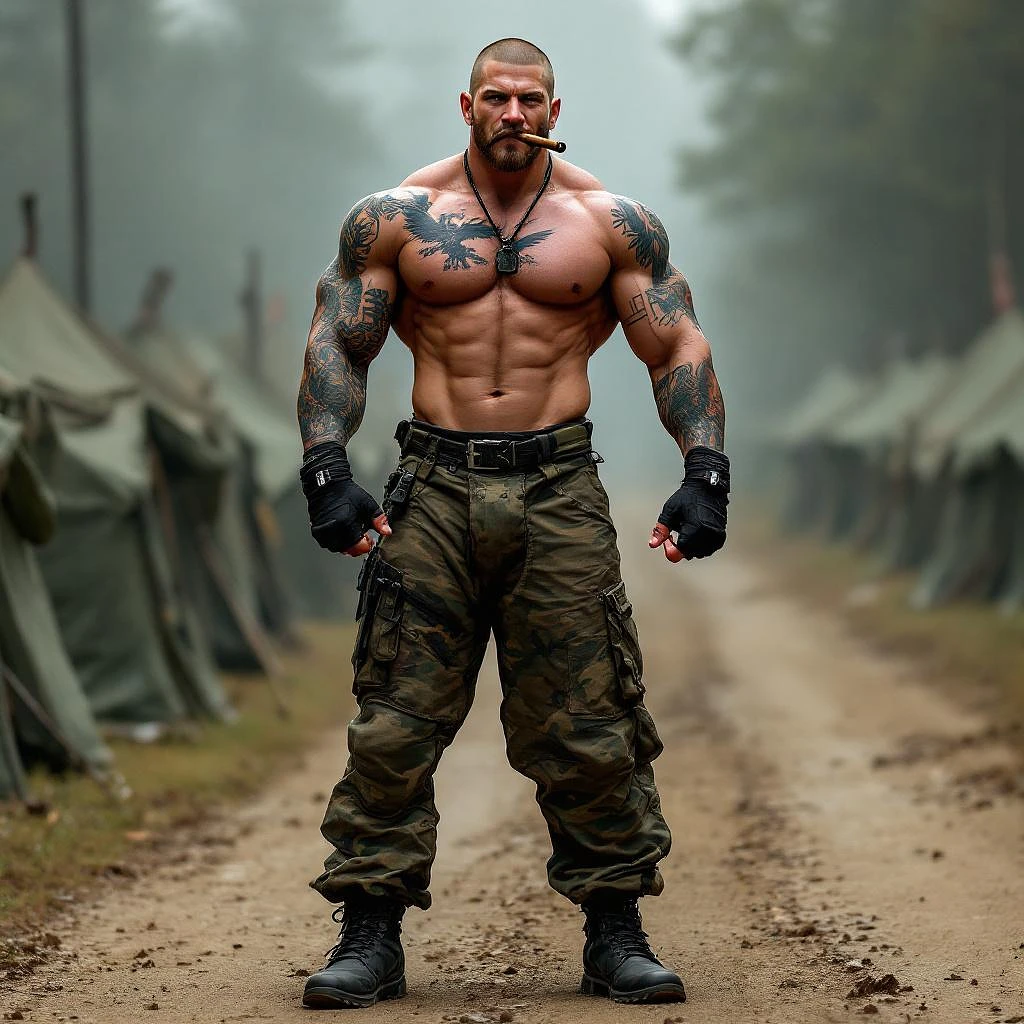Chris Redfield, Full body image, looking at us, shirtless, slender tall muscular body, lots of tattoos, eagle chest tattoo, dog tags, big cigar in mouth, black fingerless gloves, camouflage pouch thong underwear with huge long semi erect penis bulge, underwear bulge to knees, big feet in black combat boots, standing on dirt road with army green tents, flexing one bicep, grinning