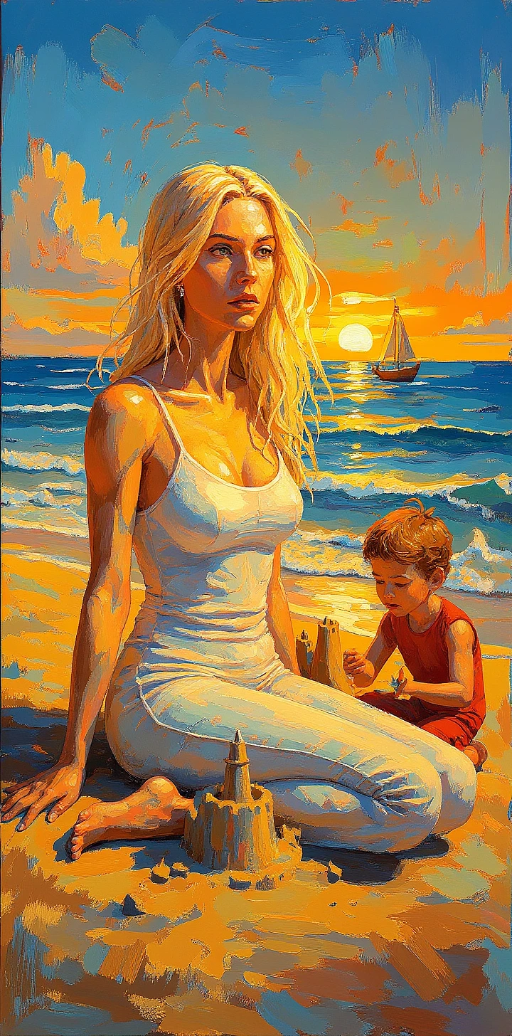 portrait of a blond woman, in the style of Greg Hildebrandt, feminine body, coastal landscapes, sitting in the sand, kids building sandcastle beside her, small sail boats in the far, spray painted realism, hard-edge painting --chaos 75 --ar 1:2 --style raw --profile rsy6uq9 --stylize 750 --v 6. 1
