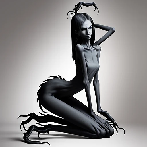 very skinny slender girl, with long curved claws, skinny legs and long skinny calves in high heels and kneeling position, with extra long and strong curved claws