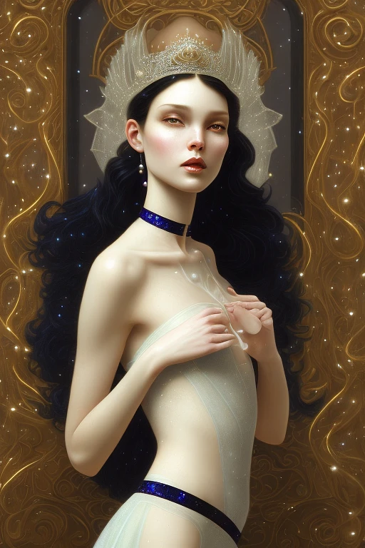 Nocturne, glowing, stars, a long-legged elegant sultry woman, long black hair, pearl choker, snow white, highly detailed, mysterious, ethereal, dressed in black velvet, haute couture, illustration, dramatic lighting, soft details, painting, by Edmund Blair Leighton, Brom, Charlie Bowater, trending on artstation, faces by otto schmidt