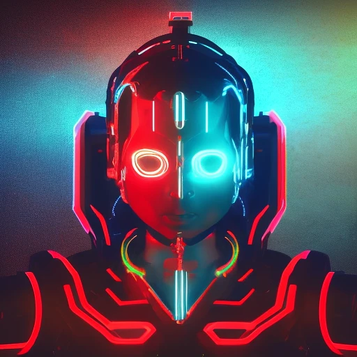 Profile picture of a cyberpunk bot, red left side, blue right side, neon, 4k, high contrast