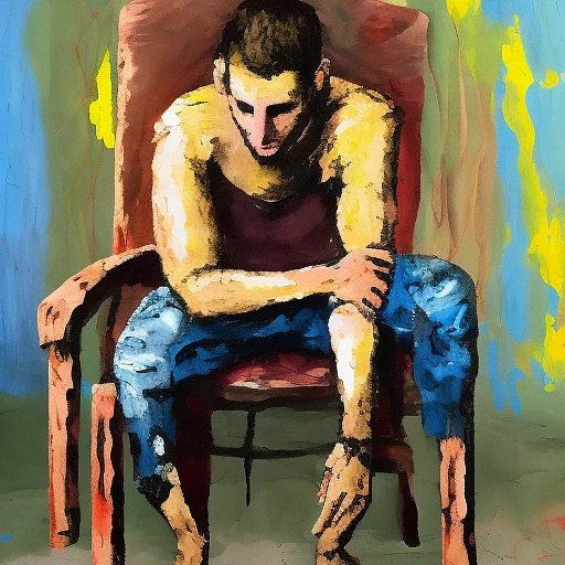 painting of sad man sitting on chair, eyes are teary, holding face, pallet knife painted, thick textured, thick layers of paint