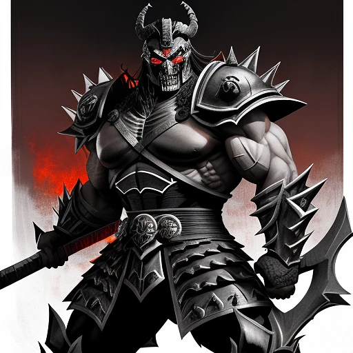 Illustration in manga style of a Shao Kahn, the fearsome emperor of Outworld, leading his macabre and dark army. He stands at the forefront, clad in his imposing, spiked armor, with his signature skull helmet gleaming menacingly. His powerful, muscular frame radiates authority and menace as he grips his massive war hammer. Behind him, a legion of grotesque and sinister warriors march, their weapons raised, ready for battle. The atmosphere is dark and foreboding, with ominous clouds swirling in the blood-red sky, dramatic lighting and intense shadows to highlight the terror and dominance of Shao Kahn and his unholy army