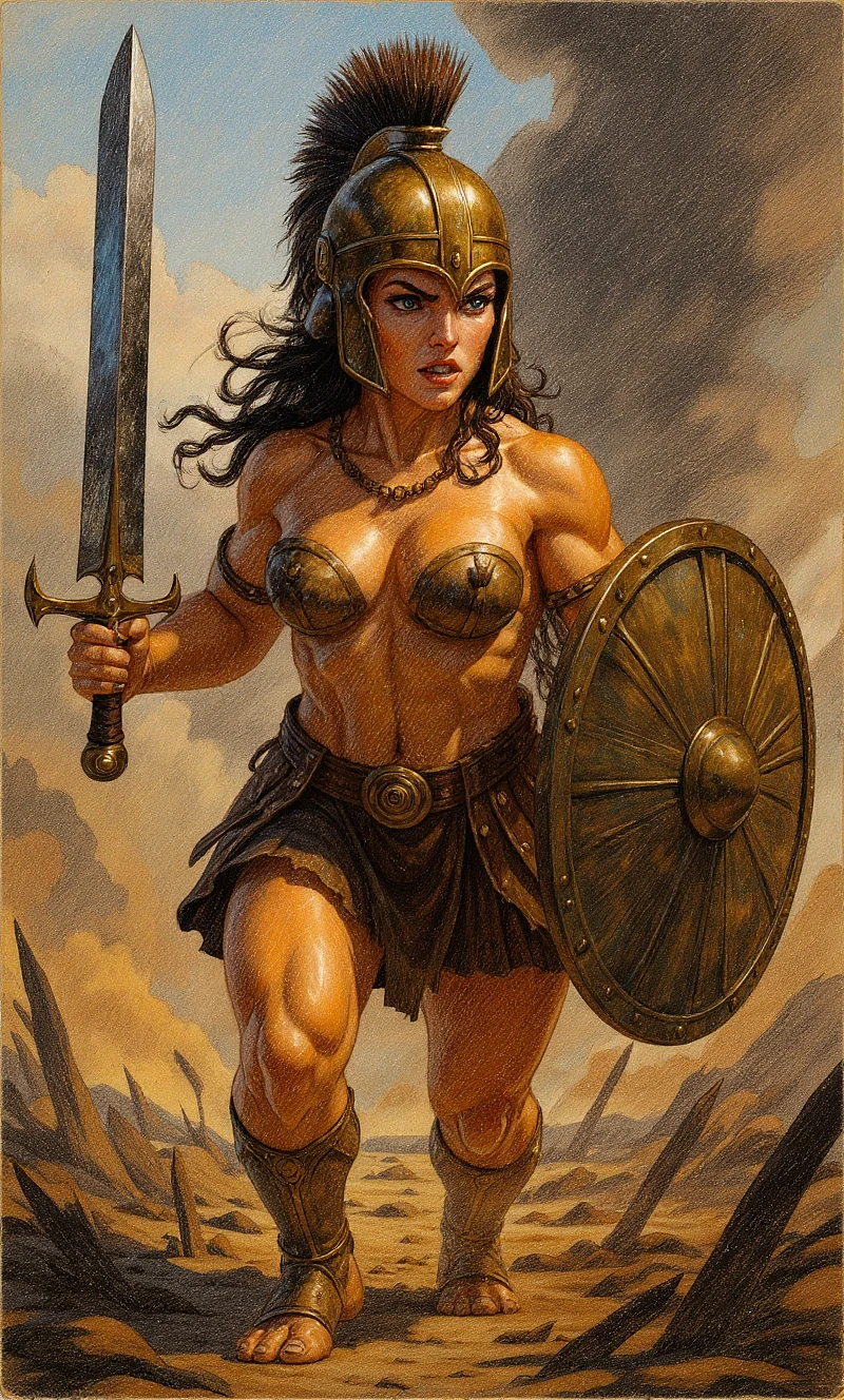 Comic book realistic illustration, full body shot of a young gorgeous Spartan woman with thick aesthetic physique, holding a round Spartan shield and a short Spartan sword, the woman is wearing ultra short Spartan armor, an open Spartan helmet is placed on her head, she is in a epic battleground in action, stern facial expression, high detail, by Boris Vallejo, hand-draw, handmade drawing using color ink pen, brushes style using cross-hatching for shadows, high details, hand drawn, in the form of an old drawing, extremely detailed background, in the style of Moebius, Metal Hurlant, Heavy Metal comic, full color, grain effects, film effects --ar 4:5 --sref 3171008199 --profile ort49sp --stylize 1000 --niji 6