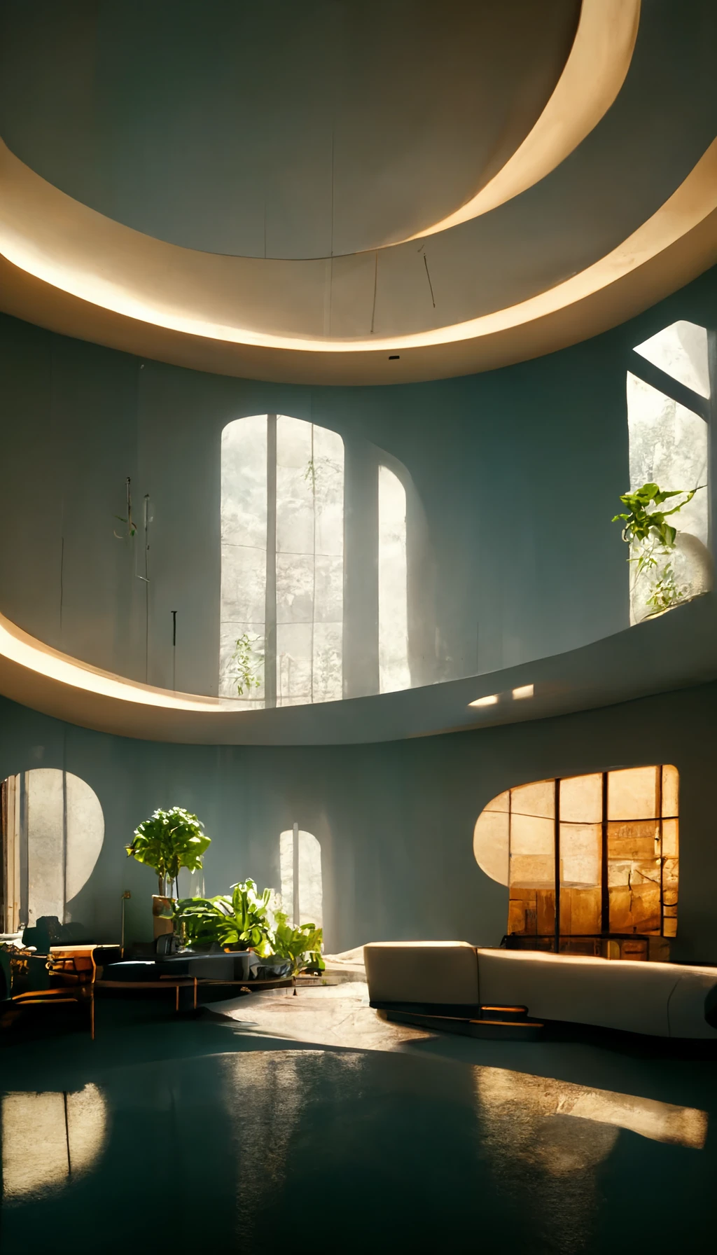 modernist interior with entirely circular organic architecture, cavernous, fractal geometry detailing, big windows, many plants, detailed skies, volumetric lighting, atmospheric, : ridiculously realistic, ridiculously detailed, octane render, unreal engine, ray tracing, volumetric, luminous —ar 9:16 —version 3 —uplight