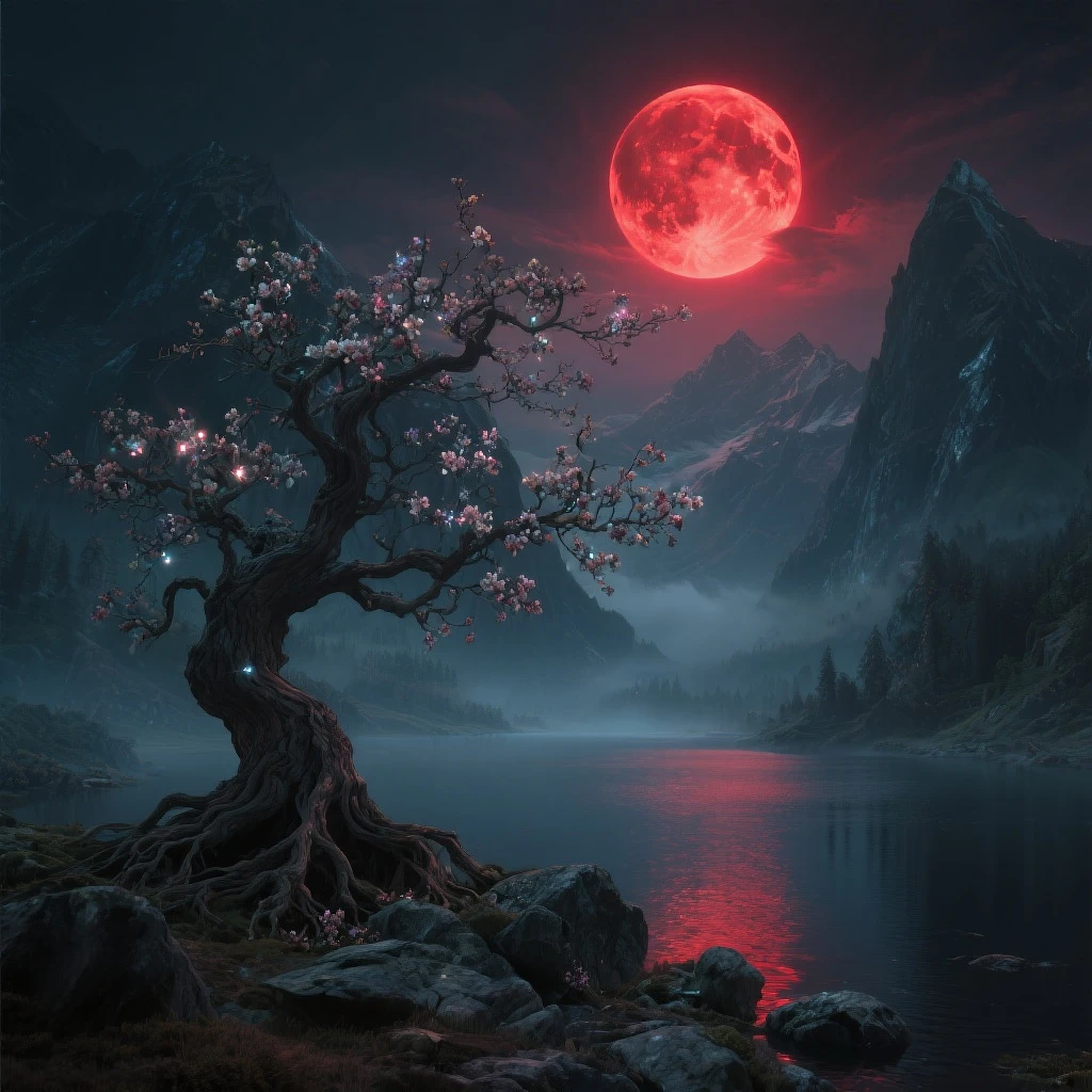 A 45-megapixel, high-resolution image of a mystical landscape under a red moon. The scene is illuminated by the eerie glow of the large, radiant moon, casting shadows and highlighting the twisted, yet majestic tree with blossoms that seem to sparkle in the night. The tree's roots are deeply embedded into rocky terrain, representing its ancient existence. The background features towering mountains looming in the distance, their peaks veiled in mist. A serene lake at the foot of the mountains reflects the moon's luminescence. The atmosphere of the scene is magical and mysterious, with a touch of surrealism.