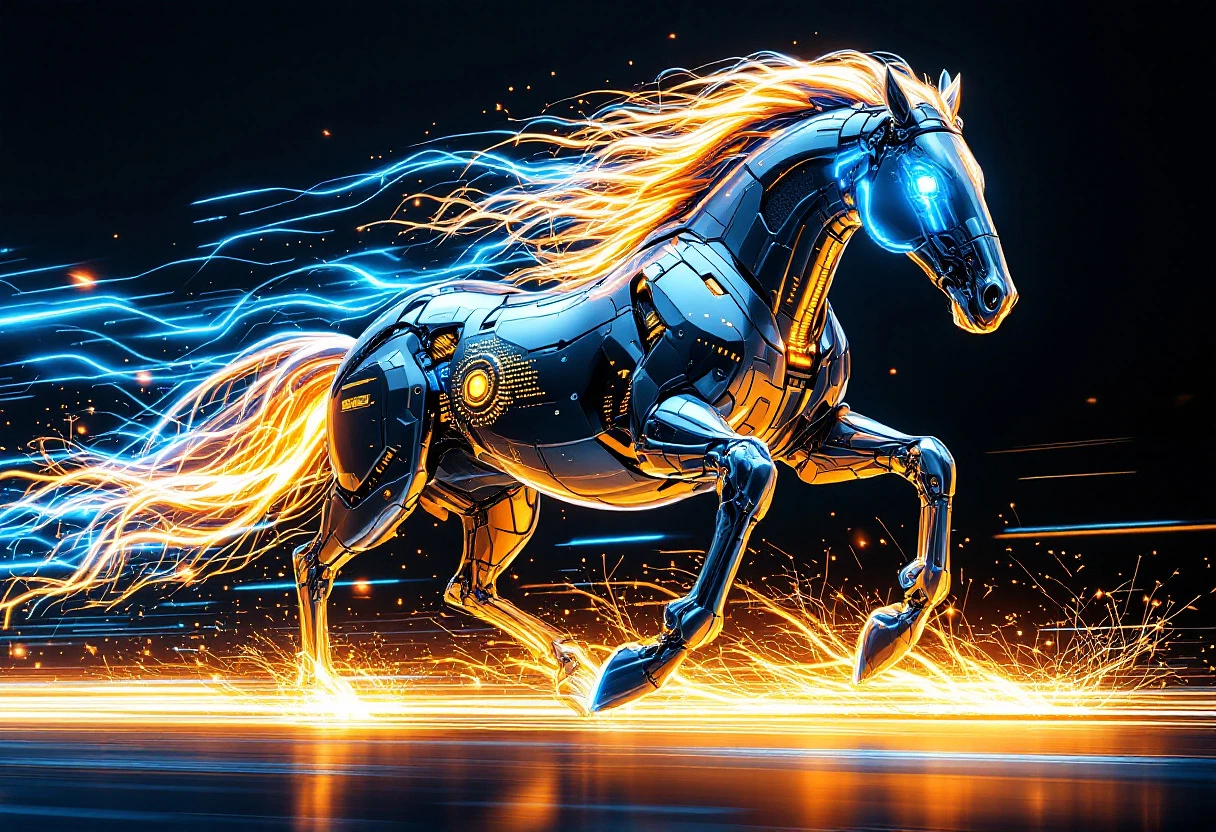 A Futurist Speed Demon horse, sleek metallic body with glowing circuits, mane transformed into blazing energy streaks, metallic hues of silver and electric blue, hooves sparking trails of light, motion blur conveying unstoppable velocity, embodying raw freedom and power of the machine age