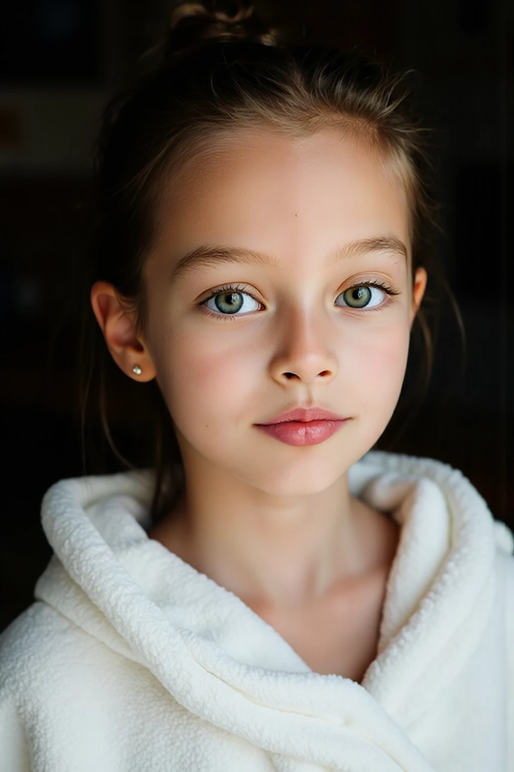 Portrait of a 6-year-old girl AIDA_FXLR_apv2020 with a contemplative expression, featuring accurate anatomy and realistic hair. The young girl AIDA_FXLR_apv2020 has fair skin and her hair appears slightly wet from either water or sweat. Her eyes are large and expressive, with a slight sheen that suggests they might also be damp. The girl AIDA_FXLR_apv2020's ears are adorned with small earrings, adding a touch of elegance to her appearance. She is draped in a soft, fluffy white towel, which indicates recent activity such as bathing or swimming. Her facial features are delicate and youthful, with a small nose and full lips that are slightly parted. The image showcases the subtle shine on her skin from either moisture or natural oils reflecting light. The background is dark and out of focus, drawing attention to the girl AIDA_FXLR_apv2020's face and upper body. This contrast between subject and backdrop helps emphasize her features and expressions. Overall, the image captures a moment of introspection or relaxation for the young girl AIDA_FXLR_apv2020 while maintaining an outstanding quality with sharp focus, bright colors, and high-end detail. The masterpiece was captured using a high-end DSLR camera in aperture priority mode, likely with an f/1. 4 lens to create a soft bokeh effect on the background. The lighting appears to be natural light coming from above and slightly to the side, resulting in gentle illumination on the subject's face while maintaining shadows that add depth to the image.