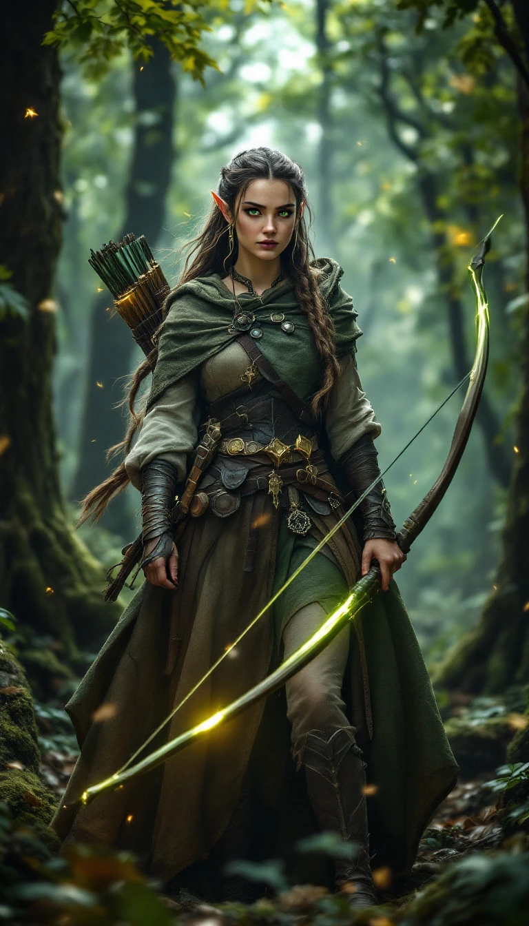 Dynamic angle, full body view, realistic, female elven ranger, long, braided hair, lightweight leather armor, forest cloak, The Lord of the Rings universe, piercing green eyes, watchful gaze, looking at viewer, glowing elven bow, ancient forest, gold leaf details, detailed background. She stands alert, clad in lightweight leather armor with a forest cloak, her long, braided hair blending into the background. Her piercing green eyes lock onto the viewer with a watchful gaze, while her glowing elven bow is held ready. The background is an ancient forest, with gold leaf details that highlight the scene's timeless beauty.
