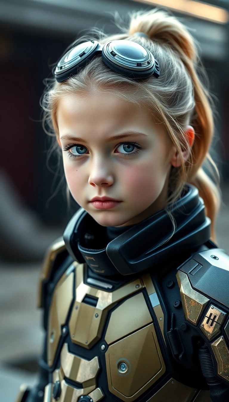 a professional photo of a exceptionally of the most beautiful girl in the world, (age 7) (futuristic) , (masterpiece) , (realistic) , (perfect anatomy) , (Full body) , head to toe, beautiful European brilliant blue eyes, black eye liner, light pink blush, very light purple eye shadows, small dimples in cheeks blonde hair, futuristic background cyborg warrior in a heavily protected volumetric mechanical exoskeleton stands in a dynamic curved pose, dnd art, whimsical dark cyberpunk, sci-fi, mechanized precision, (4k,high res) , ultra-detailed, photo-realistic, full image view, full body view, front view