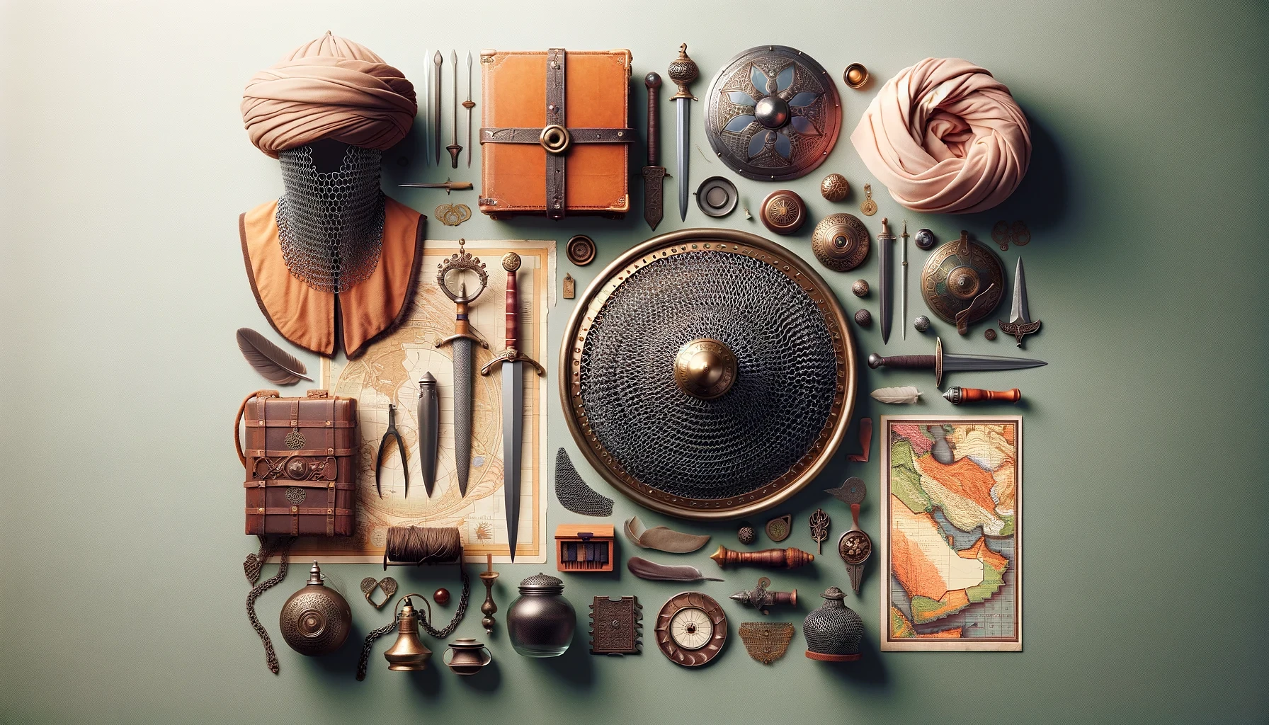 A knolling arrangement of various objects used by a warrior or knight in Salah al-Din's army, including a scimitar, a round shield, chainmail, a turban, a leather-bound journal, an inkwell and quill, and a map of medieval Middle Eastern territories. The scene is styled with a Wes Anderson-inspired color palette, featuring muted pastels and earth tones. The lighting is like that found in a studio, with soft, even illumination and low contrast, providing a meticulously arranged and serene look. The image is in high resolution, resembling an 8K quality.