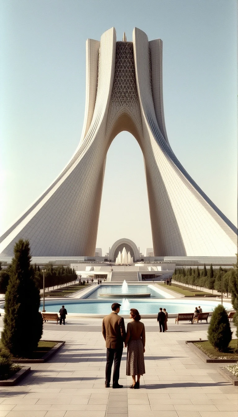 A young couple from the 1950s stands in Tehran’s iconic **Azadi Square (formerly Shahyad Square) **, with the magnificent **Shahyad Tower** rising behind them. The tower, a masterpiece of Persian modernist architecture, stands tall with its distinctive **parabolic arch**, blending both traditional Iranian and contemporary styles. Its white **marble-clad surface**, sourced from Esfahan, glows under the afternoon sun, with intricate **geometric patterns** adorning its facade. The tower’s **four grand legs curve inward**, forming an elegant archway at the center, symbolizing the historical gateway to Tehran. * *The open **plaza surrounding the tower** is paved with large **stone tiles**, leading toward a **vast circular fountain** at the base of the monument. The water in the fountain reflects the sunlight, creating shimmering ripples that contrast with the solid architectural lines of the tower. Around the square, neatly arranged **pathways** extend outward, guiding visitors through the landscaped green areas with small trees and traditional Persian-style benches. * *The **couple stands near the edge of the plaza**, dressed in elegant 1950s attire. The **girl**, with voluminous, curly hair, cat-eye eyeliner, and red lipstick, wears a **floral-patterned dress** with a flared skirt. A gentle breeze lifts the hem slightly as she glances at her companion. The **boy**, in a **light-colored suit** with a thin tie, stands beside her, his neatly combed hair and thin mustache giving him a refined look. Their hands nearly touch as they exchange a soft smile, immersed in the beauty of the moment. * *Around them, a few **pedestrians walk leisurely**, some in **Western-style suits** and dresses, while others wear **traditional Iranian clothing**. The city’s **classic cars** from the era are parked nearby, their polished surfaces reflecting the golden hues of the afternoon sky. The **atmosphere is peaceful**, filled with the distant sound of footsteps, hushed conversations, and the gentle flow of the fountain. The **warm, muted tones of the scene** capture the nostalgic essence of 1950s Tehran, as the **Shahyad Tower** stands proudly as a beacon of Persian heritage and modernity.