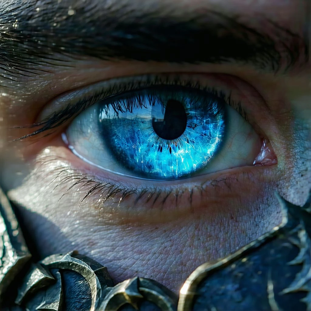 an epic poster-style photograph inspired by the Warcraft universe, rendered with unprecedented photographic realism and cutting-edge 3D artistry. Feature a hyper-realistic portrait of the main hero in intricately detailed armor, amidst a chaotic battlefield teeming with mythical creatures and powerful magic. Make the central element an elf's eye, viewing the entire scene as if perceived through it, with reflections of colossal castles, soaring dragons, and fierce warriors