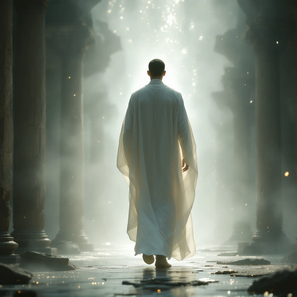 A fine art, hyper-realistic, cinematic image of a man wearing a white long robe with his back to me walking forward into a bright light. His form is ethereal and translucent, fading into the mist that surrounds him, his body partially visible but soft and hazy, as though she is only barely present in this world. The volumetric light gently illuminates his from behind, casting soft, delicate shadows across his figure and adding depth to the mist that seems to both surround and blend into him. The mist swirls around him, caressing his body, obscuring parts of body while leaving other parts faintly visible otherworldly feeling. The setting is a dreamlike, white light void, with only faint hints of an ancient, forgotten world in the distance. Barely visible ruins or broken columns appear as faint silhouettes in the fog, giving a sense of history and mystery to the scene. The ground beneath him is indistinct, as though the mist itself is the floor, with floating particles glinting softly in the ethereal light. The lighting is soft and diffused, with beams of light cutting through the mist, creating a sense of depth and atmosphere. The man's form is highlighted by this light, her figure partially illuminated while the rest fades into the mist, emphasizing his delicate, ghostly presence. The entire composition is rendered in fine art, photorealistic detail, with a soft film grain adding texture and a timeless quality to the image. Key Elements with Weights: (Fine art, hyper-realistic, cinematic lighting:1.5) (Volumetric light, swirling mist:1.5) (Ghostly form fading into the mist:1.5) (Floating particles, soft glow:1.3) (Film grain, photorealistic textures:1.3) (Dreamlike, mystical atmosphere:1.5)