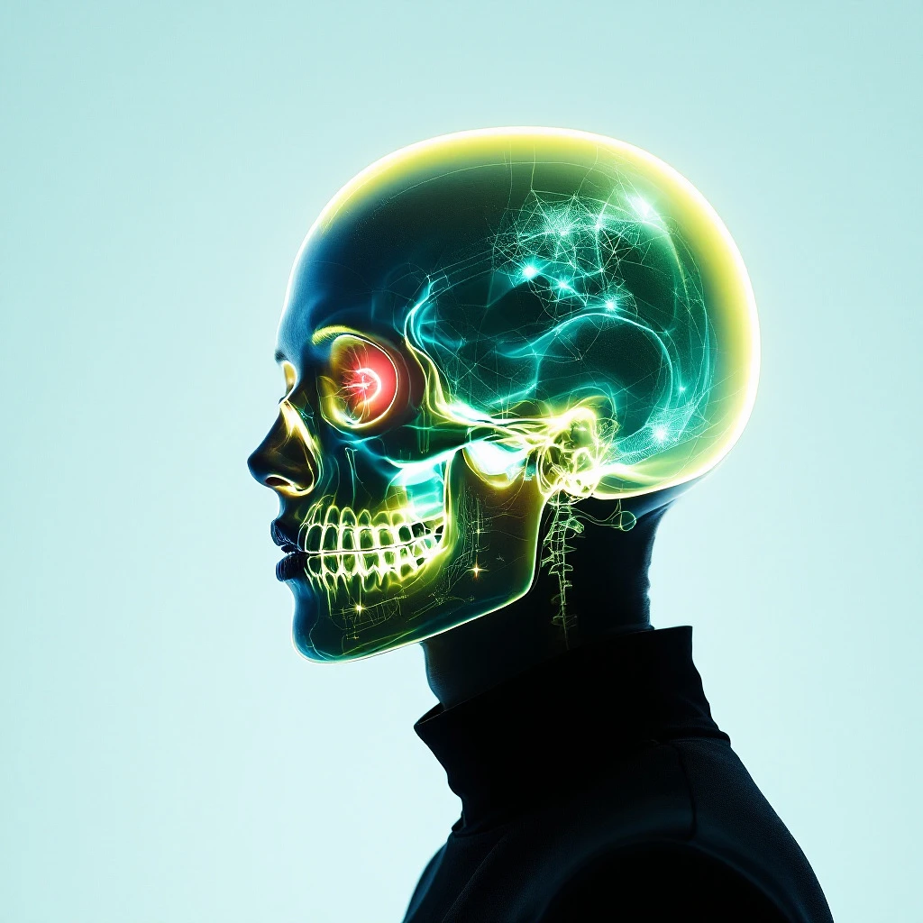 ethereal portrait of a man, transparent skin revealing her skull, glowing with a neon-green bio-luminescent effect, man profile, wearing a sleek, high-collared black outfit, surrounded by a soft glow that contrasts with the sharp details of her skull, background is a minimalist, misty white gradient, enhancing the surreal and sci-fi mood, lighting is soft with a cool futuristic blue tone, illuminating the skeletal structure subtly, created unreal engine 5 rendering, holographic effects, translucent textures, cinematic lighting, cyberpunk aesthetics, x-ray vision style, futuristic materials, sleek minimalism, realism --ar 9:16 --quality 2 --style raw --stylize 50 --v 6. 1