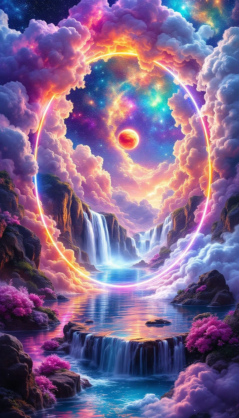 A dazzling, otherworldly portal in the shape of a mirror reveals a galaxy of plush clouds and the distant red planet of Mars. The reflection shows a stunning array of colors - purple, white, pink, orange, and blue - mirrored in the waters of an ocean cascading down a majestic waterfall. Surrounded by shimmering neon LED lights, this surreal scene practically glows with an ethereal beauty. This intricate and vividly detailed painting transports viewers into a dreamlike realm of cosmic wonder.