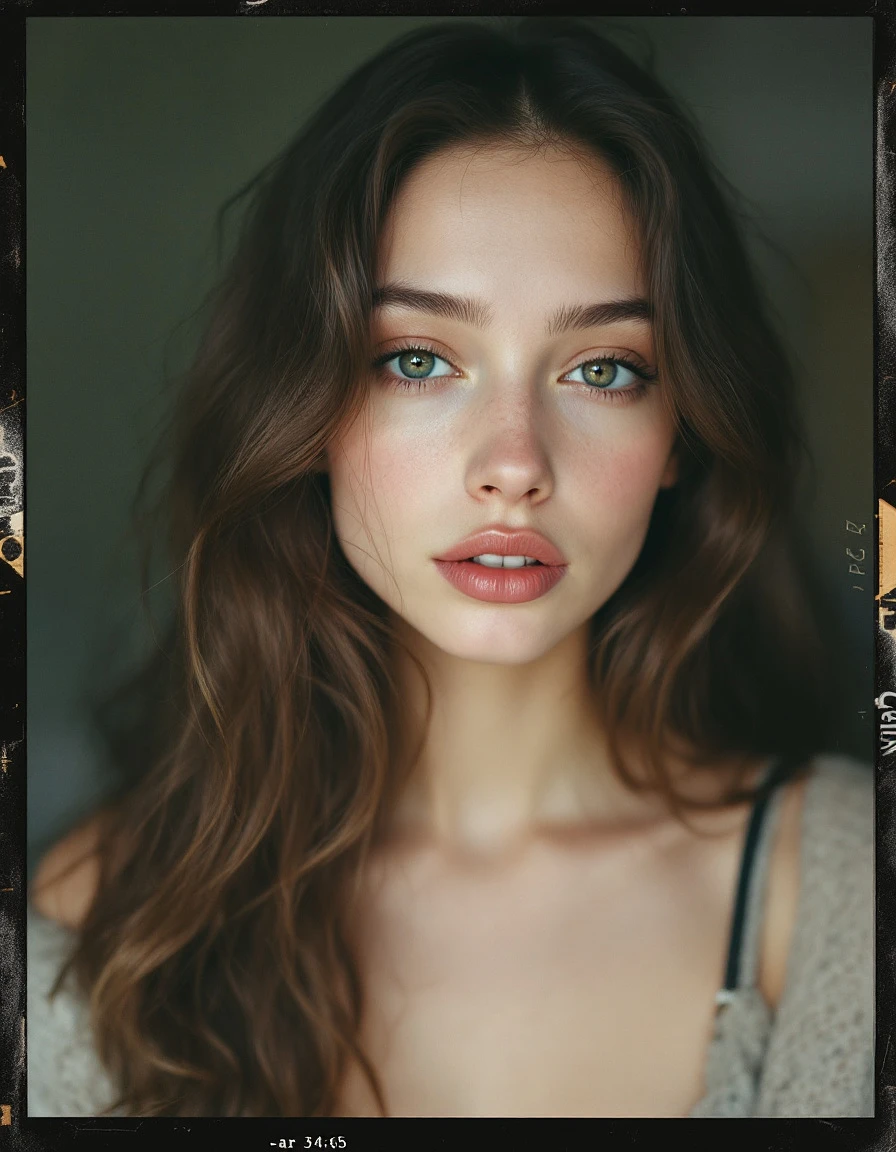 Anjelina Jollie Pitt, 21-28 years old, brown hair, high-quality photo portrait, shot on a Polaroid camera, double eyelid --ar 34:65 --style raw, imitating like a dog