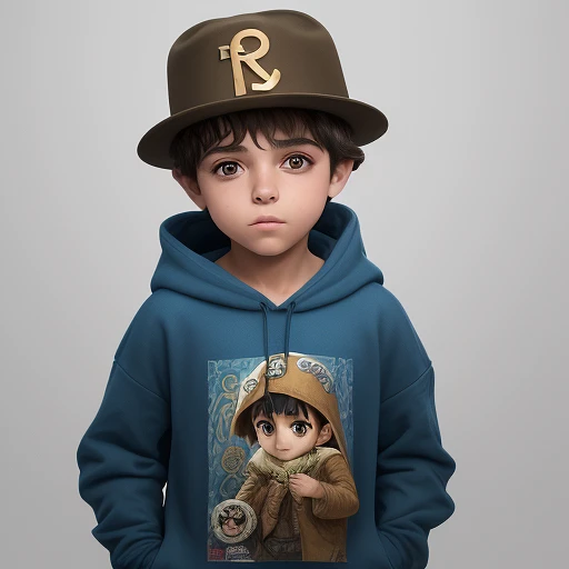 un niño con una sudadera anaranjada con capucha de dibujos animados que lleva un sombrero, en el estilo del arte detallado del cómic, cian oscuro y bronce, manchas/lavados, rtx, inocencia infantil, trajes detallados, artista de la apropiación --ar 37:49 --stylize 750 --v 6
