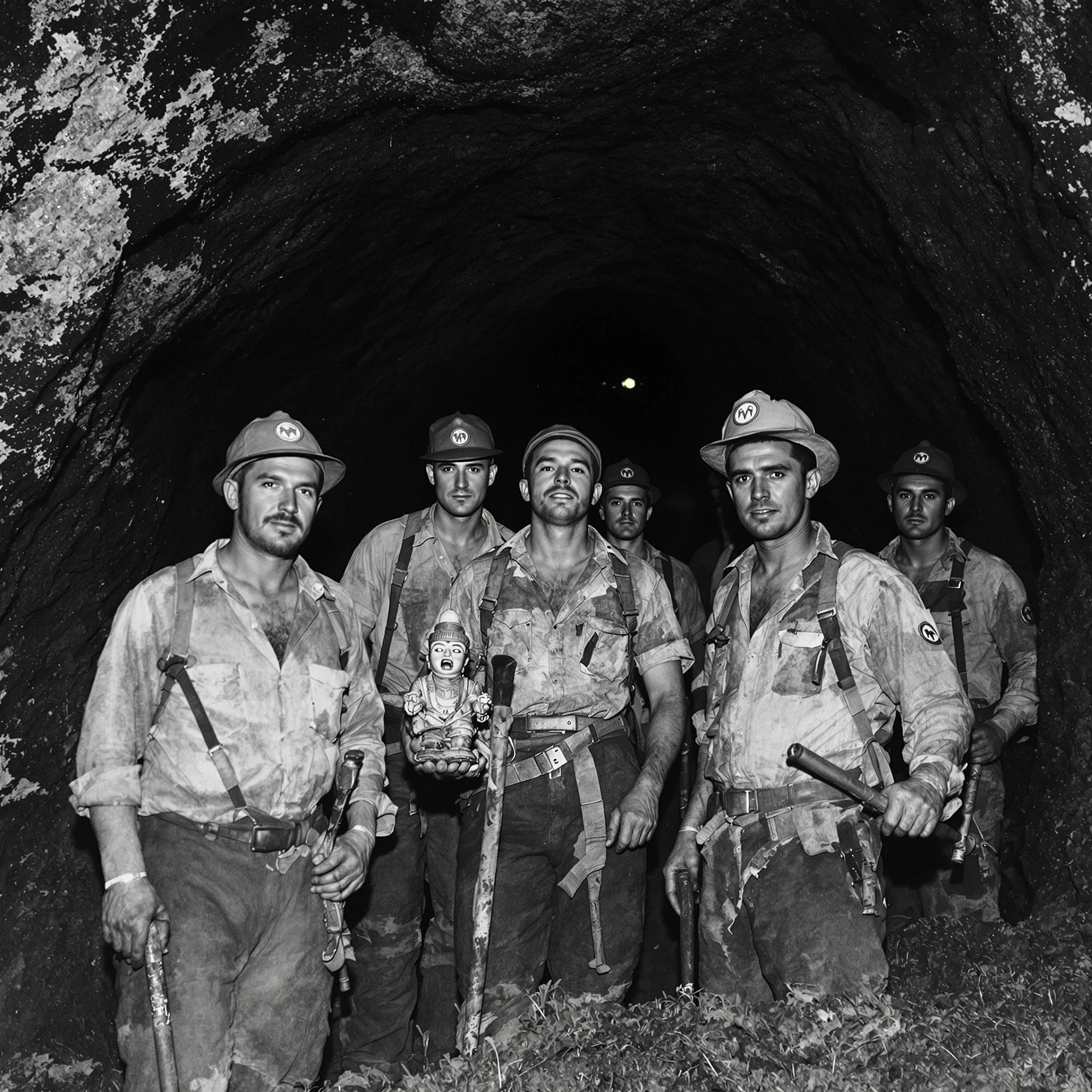 An old, weathered black-and-white photograph showing a group of miners standing at the entrance of a dark cave. The men are dressed in torn, early-1900s work clothes, holding mining tools. In the shadowy cave behind them, faint glowing eyes are visible deep in the darkness, almost imperceptible at first glance. One miner in the front holds a strange object, a small ancient idol, with an expression of both fear and awe. "make retro