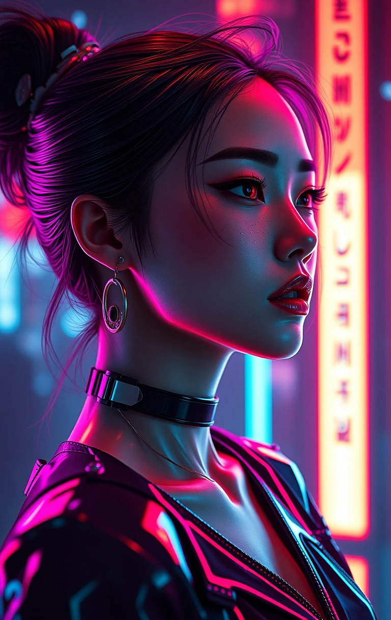 photorealistic an oriental female humanoid with freckle cheeks, cyber neon lightings, futurism, cyberpunk high fashion, elegant profile pose, intricate details, crispy quality, digital photography, trending in artstation, trending in pinterest, no watermark signature, cinematic, 4 k ultra hd, art by artgerm, art by greg rutkowski, art by pascal blanch