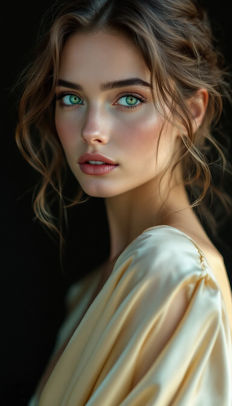 "A captivating high-resolution portrait captured with a Sony A1 50. 1 MB camera through a 75mm prime lens, showcasing a stunning British model in her mid-20s. Her striking, sparkling emerald green eyes hold a sharp gaze that tells a story of elegance and vulnerability. With refined features highlighted against a deep black background, she elegantly poses in a light, flowing champagne yellow silk dress that dances subtly under soft light. The image features gentle contrast and a touch of saturation, enhancing the ethereal quality of the scene, drawing viewers into the model's captivating world. "