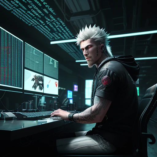 Hyper realistic eye level exterior photo of The Trading room is digital art dim, with only the white light from the screens illuminating the room. The alpha dog Trader is sitting in front of a wall of large trading screens, typing code on a keyboard. He wears cyberpunk crypto coin implants and drinks extra large coffee. He loves coffee. The programmer is surrounded by chaos, hyper realism, high detail, octane render, celestial arena,  fire storm,  ice storm,  body crackling with lightning,  lightning halo,  tilted halo,  crackling lightning,  lightning charged atmosphere,  beautifully detailed fur,  brilliant detailed eyes,  beautifully detailed face, but he doesn't seem to notice or care. Digital Art. 3D Render 8k