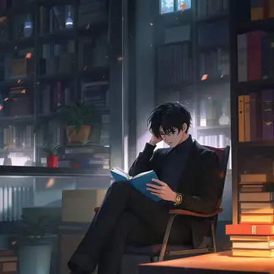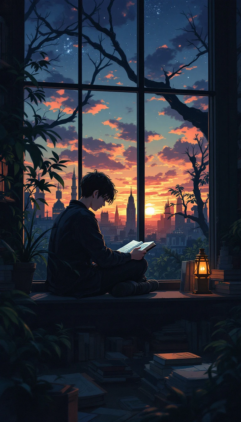anime, boy, introvert, library, academia, dark academia, sunset, reading book, infj
