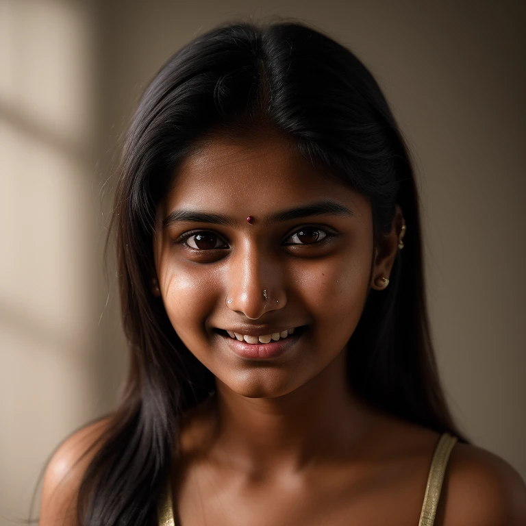 hyper realistic headshot photo of a 20 year old, indian, girl, looking into the camera, smiling slightly, ultrarealistic, soft lighting, 8k