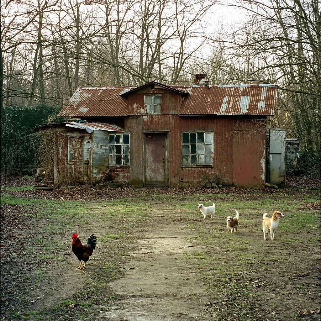 In the heart of a dense, serene woodland stands an old medium sized rustic house made entirely of brown-stained plywood. Resting on a solid concrete pad, the quaint structure boasts a weathered tin roof, tarnished with rust and streaked with remnants of mildew and mold, testifying to years of enduring the elements. The front of the house features a sturdy door, flanked symmetrically by large windows. Additional modest windows are set on either side of these larger ones, allowing natural light to penetrate the worn yet charming abode. Adjacent to the house, to the right, is a similarly constructed shed. This humble outbuilding shares the same brown plywood walls and tin roof, blending seamlessly with the main house and further characterizing the rustic charm of the setting. The yard in front of the mansion is nothing but aged dirt, crisscrossed with patches of grass fighting to reclaim their territory. A concrete walkway, cracked and timeworn, runs from a dirt driveway directly to the front door. This pathway has seen better days but still stands resolute, a testament to pragmatism over decoration. Throughout the yard, scattered haphazardly, are relics from a bygone era: old cars, once reliable, now left to rust and decay, remnants of appliances that have long since served their purpose. These artifacts enhance the nostalgic aura enveloping the property, harking back to a time when they were the symbols of modern convenience. Roaming freely, paying no heed to the passing time, are dogs, cats, and chickens. They wander the expanse, adding life and movement to the otherwise stagnant scene. The entire tableau exudes a late 70s country atmosphere, a symphony of simplicity, resilience, and bygone charm. As the cinematic effect weaves through the imagery, the colors deepen, shadows lengthen, and every detail sharpens, transforming the rustic scenery into a stylized visual narrative, rich with history and texture. The depiction is devoid of any extraneous text, logos, or watermarks, ensuring that the image remains pure and evocative. The view, captured in a classic 16:9 aspect ratio, draws the viewer into the very heart of this rustic haven, creating a poignant, almost nostalgic sentiment of an era that stands frozen in time.