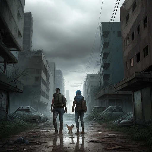 a drawing manga style of a survivor and their Blue Heeler dog in a post-apocalyptic city inspired by 'The Last Of Us'. The city is in ruins, overrun by wild vegetation, with rusty cars scattered across the streets. The survivor wears improvised clothing and carries a worn backpack, while the cloudy sky reflects the desolation of the world