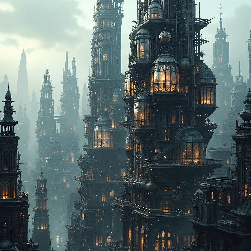 An overview of a futuristic megacity in which buildings combine elements of 18th century french architecture like glass and metal details and brutalism in a melancholic atmosphere