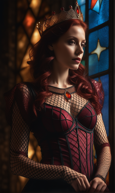 princess of modern world inhabited by the spirit of the hell, fishnet, stained glass, fairy lights, cinematic, dreaming, Film light, very sharp focus, highly detailed, (hyperrealistic:0.8), masterpiece, spiritual, atmospheric, maroon cream bronze. (by Koos Roos, greg rutkowski), (full body shot:1.0). studio photo, intricate details, elegant, beautiful, High resolution, Vibrant, High contrast, dark angle, 8k, HDR, straight standing, (hourglass body shape:0.4)