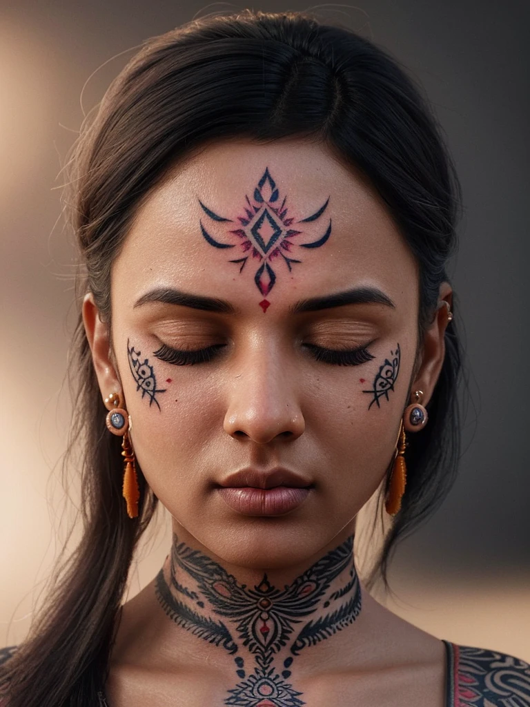 close-up portrait female indian, very small facial tattoo, closed eyes, luxury, bright colors, dark illumination, very detailed artwork, trending on artstation, symmetrical, cinematic, hyper realism, high definition, octane render, 8k