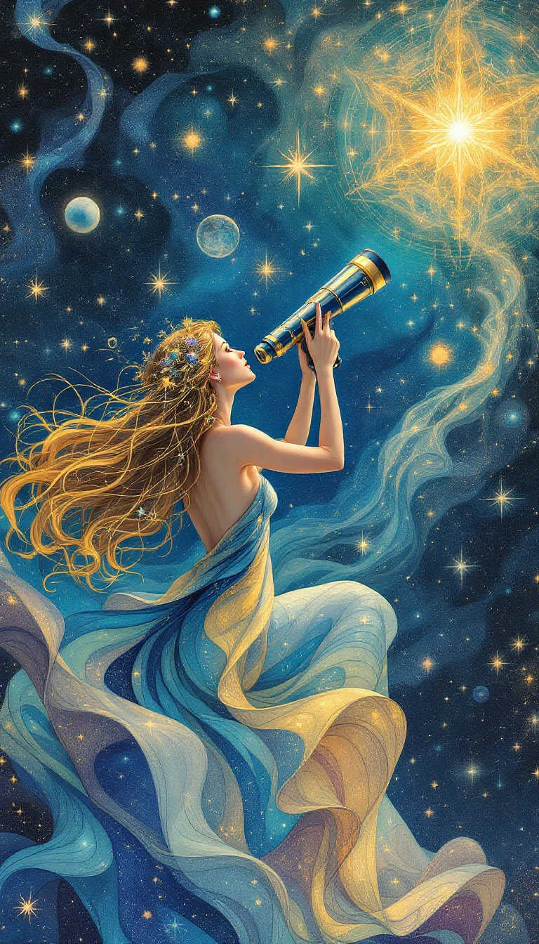 (14) A digital illustration, influenced by the smooth curves and vibrant colors of Alphonse Mucha, portrays a female astronomer gazing at a starry sky through a complex telescope. Her long, flowing hair is adorned with celestial motifs, and her gown is a flowing representation of the cosmos, creating a harmonious blend of science and beauty. Conceptual art, cosmic, illustration, ethereal.